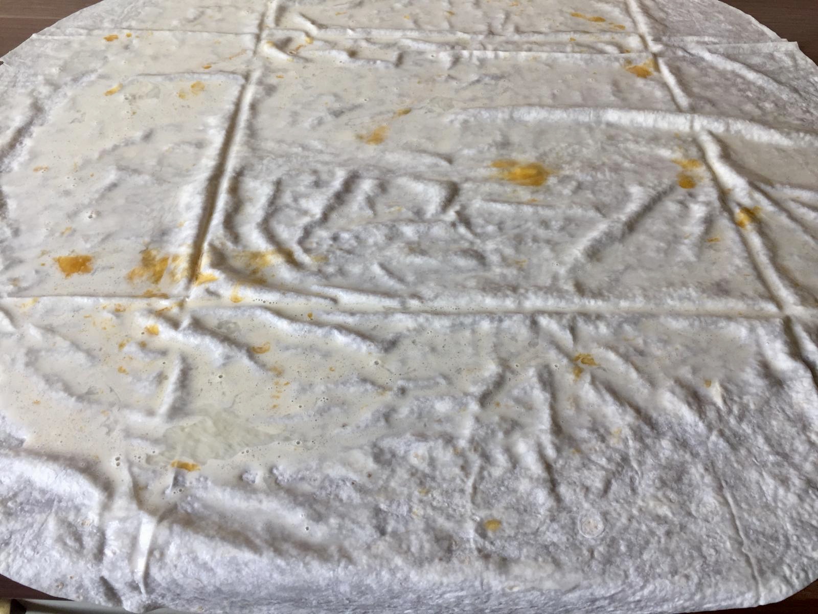 Yufka tezgah üzerine yayılır. Yağ, yumurta ve süt karışımı sürülür.