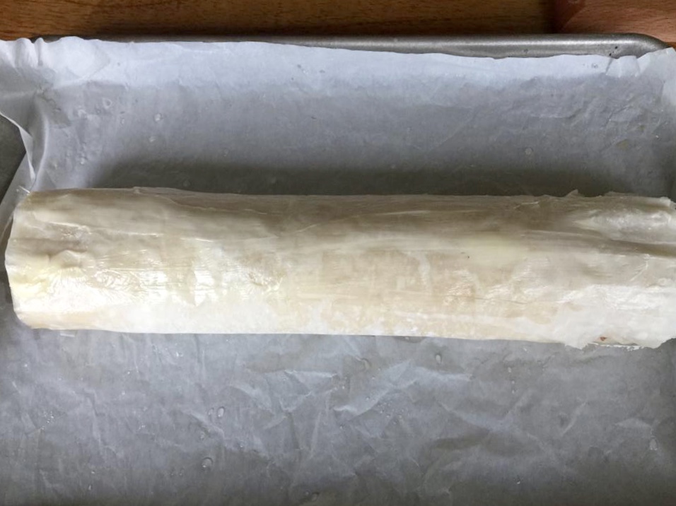 Yufka rulo şeklinde sarılır, yağlı kağıt serilmiş fırın tepsisine koyulur ve üzerine eritilmiş tereyağı sürülür.