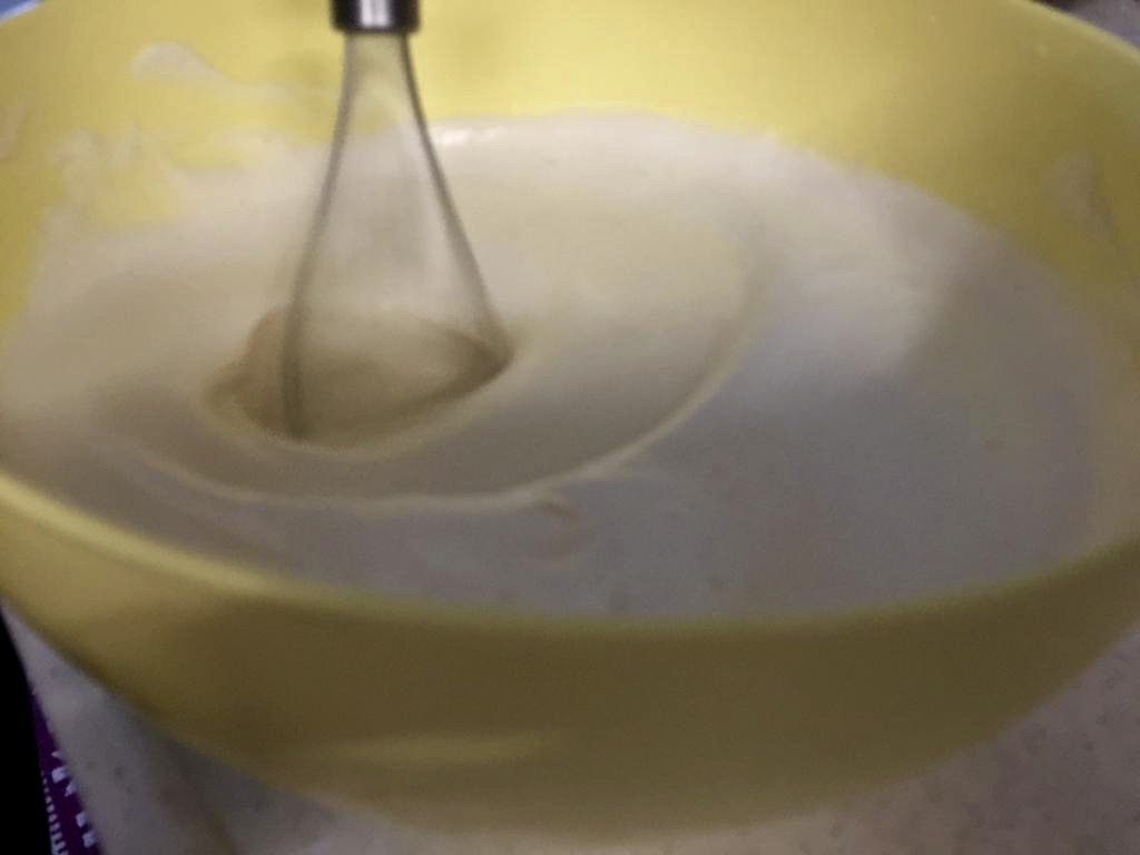 3 yemek kaşığı un, 1 yemek kaşığı nişasta, 1 su bardağı şeker ve 1 paket vanilya ilave edilip mikserle 2-3 dakika çırpılır.
