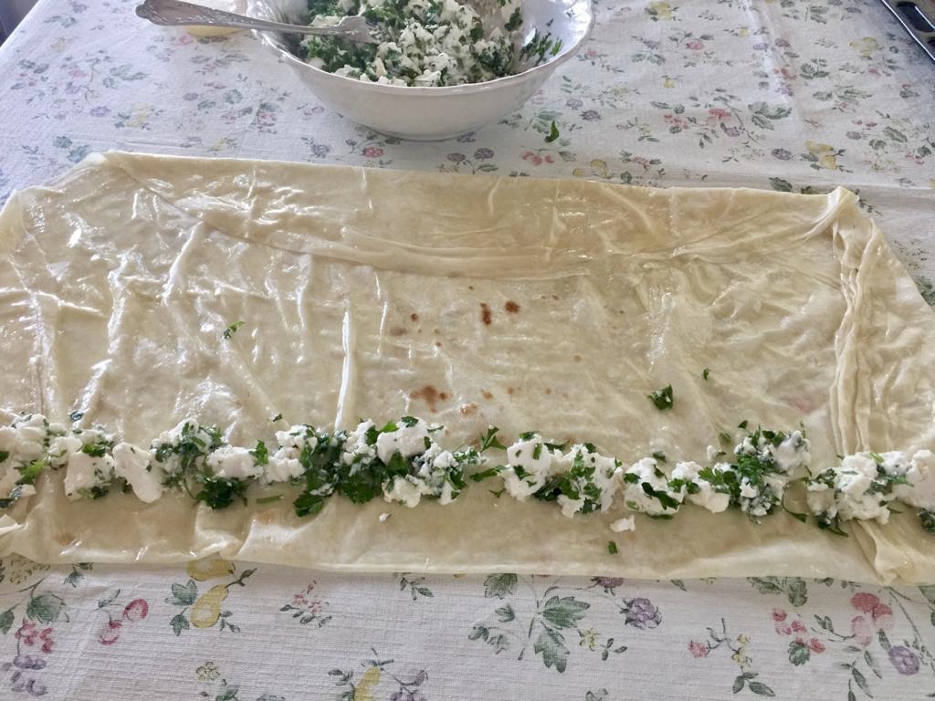 Dikdörtgen şekline getirilen yufkanın uzun kenarına peynirli harcın dörtte biri koyulur.