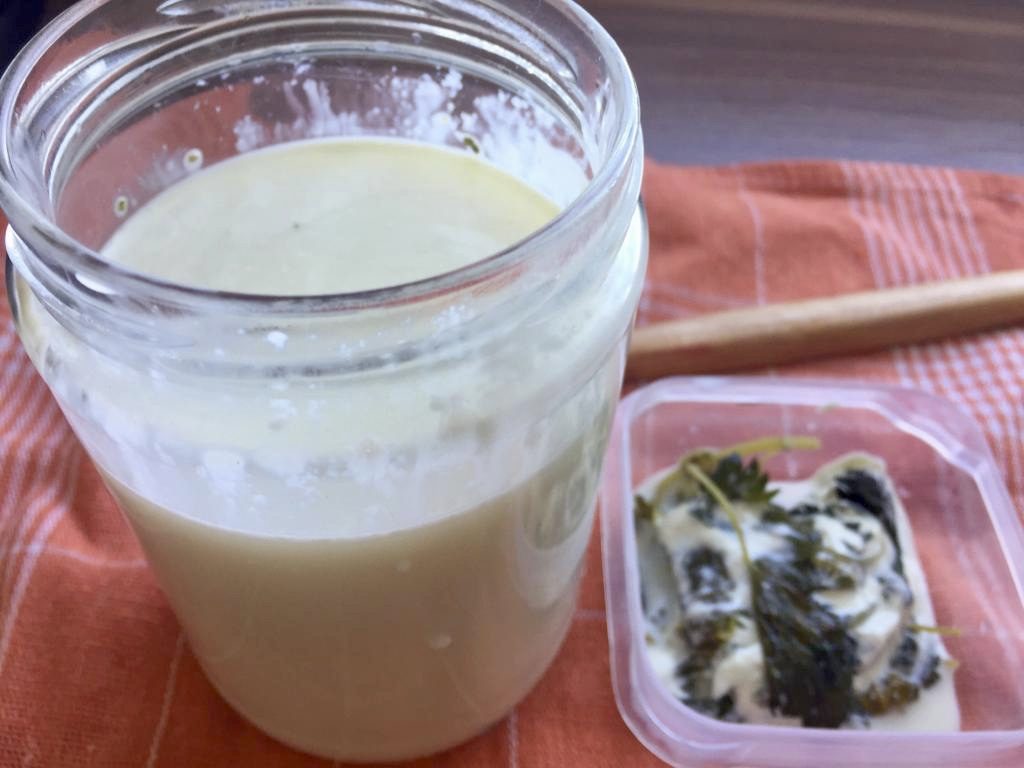 Yıkanmış doğal ısırgan otu yaprakları mayalanma sıcaklığındaki süt dolu kavanoza konulur.