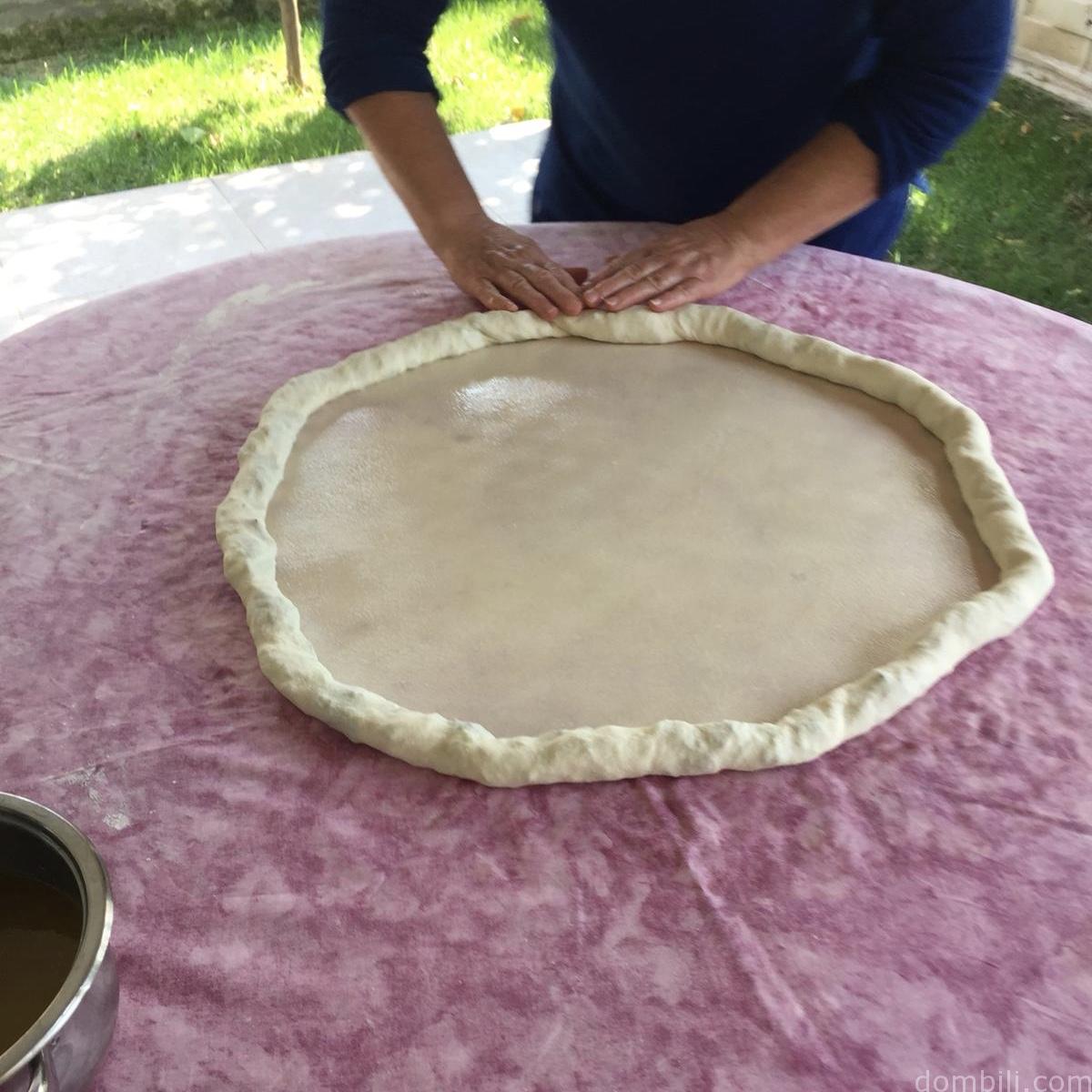 Daha sonra büyük simit haline gelince yuvarlak tepsi yağlanır ve tepsiye yerleştirilir.