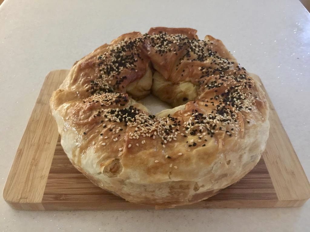 İkinci yufka patatesli iç koyulmuş yufkanın üzerine serilir. Üzerine domatesli ve kırmızı biberli kavrulmuş kıyma serpilir.