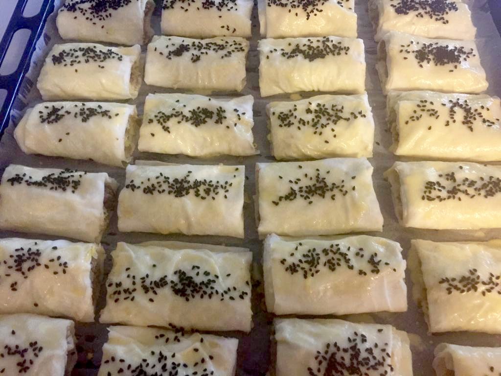 Yumurta sarısı sürülen böreklerin üzerine çörek otu serpilir.