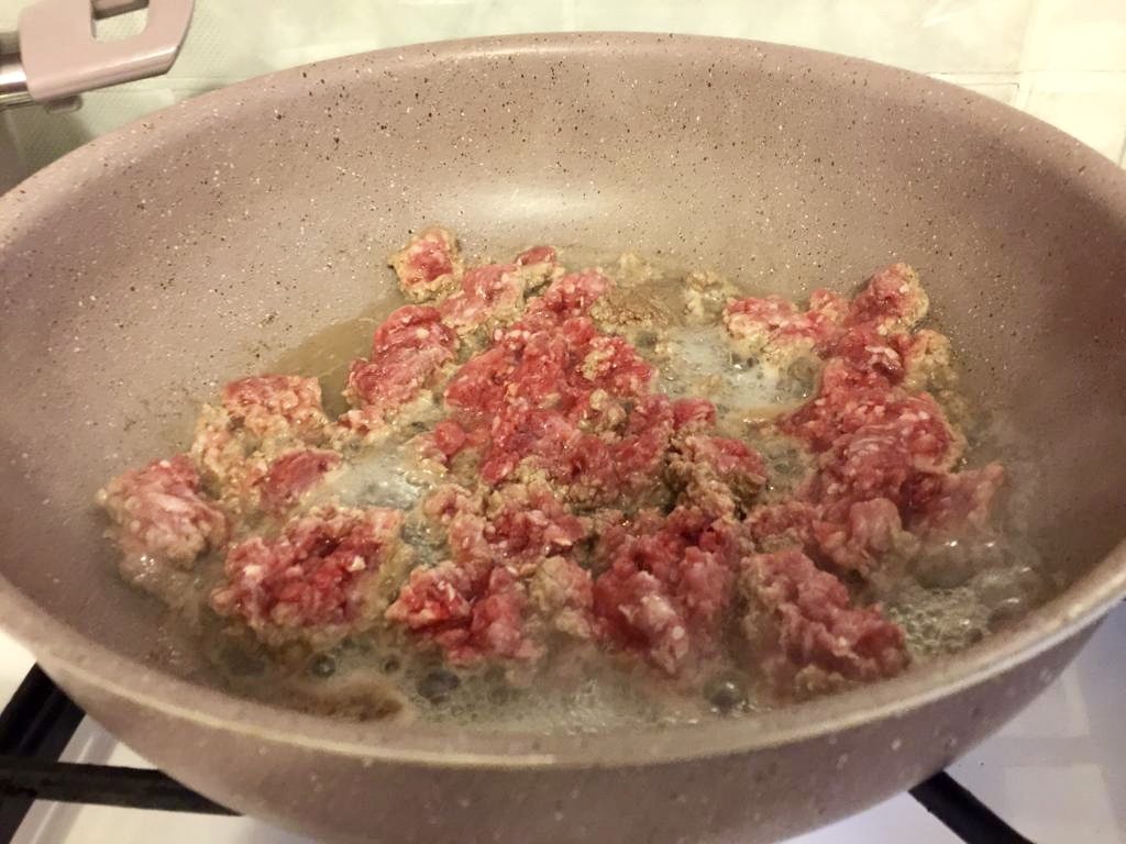 Kavrulan kıyma ve soğanın üzerine çiğden rendelenmiş 2 adet patates, 2 yemek kaşığı tereyağı, ince doğranmış maydanoz, tuz ve karabiber ilave edilir. 5 dakika kavrulur, patatesler yumuşayınca ocak kapatılır.