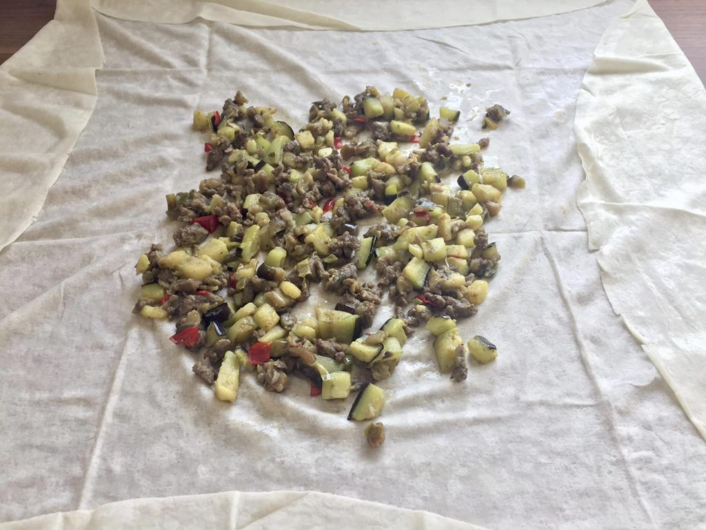 Yufka tezgahın üzerine serilir. Ortasına gözleme harcının yarısı koyulup kare şeklinde kapatılır.