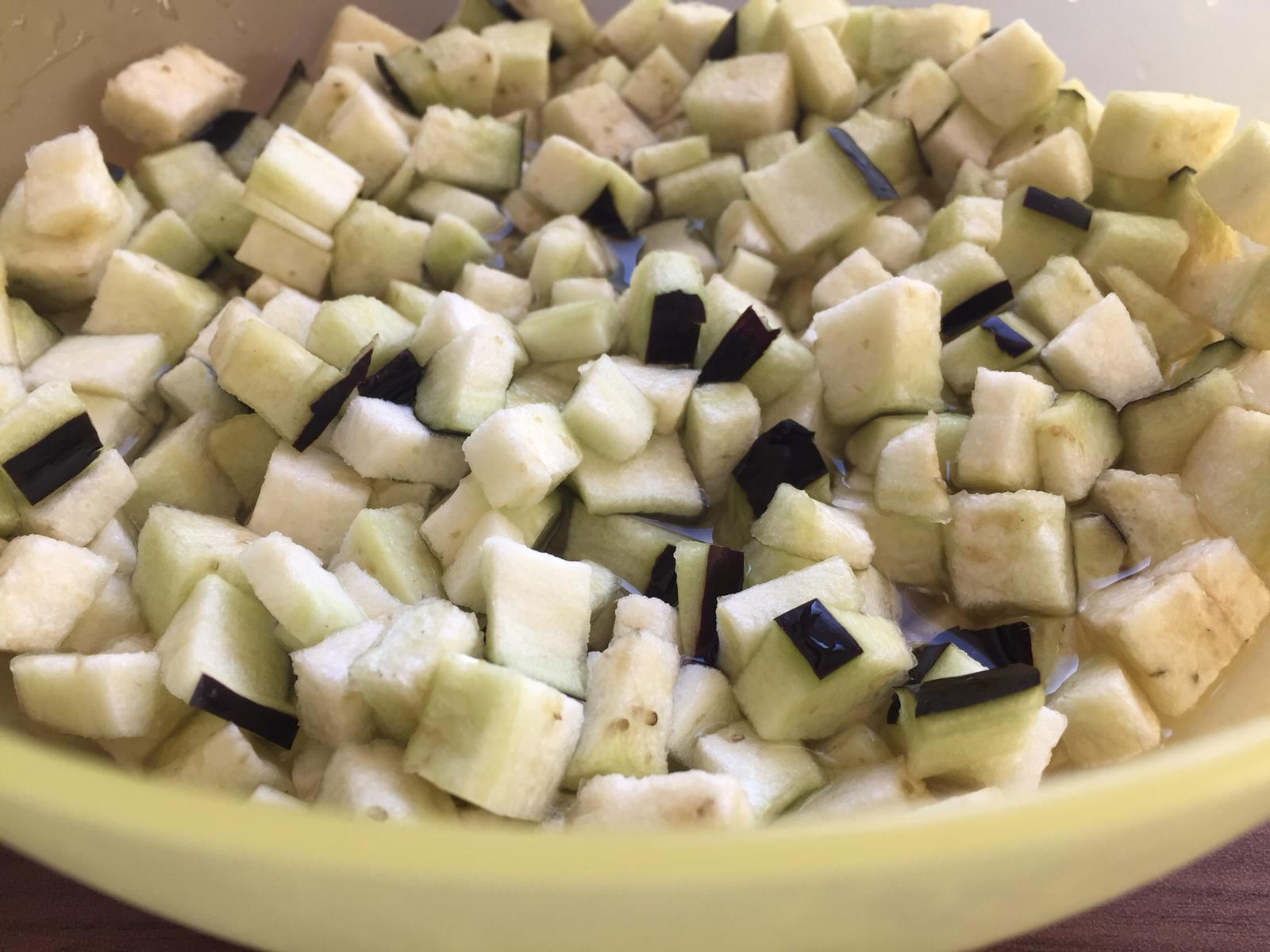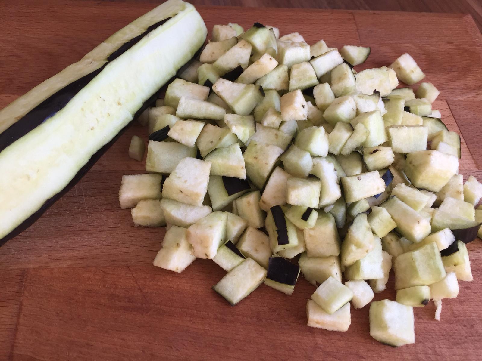 Patlıcanlar alaca soyulup tavla zarından biraz büyük doğranır.