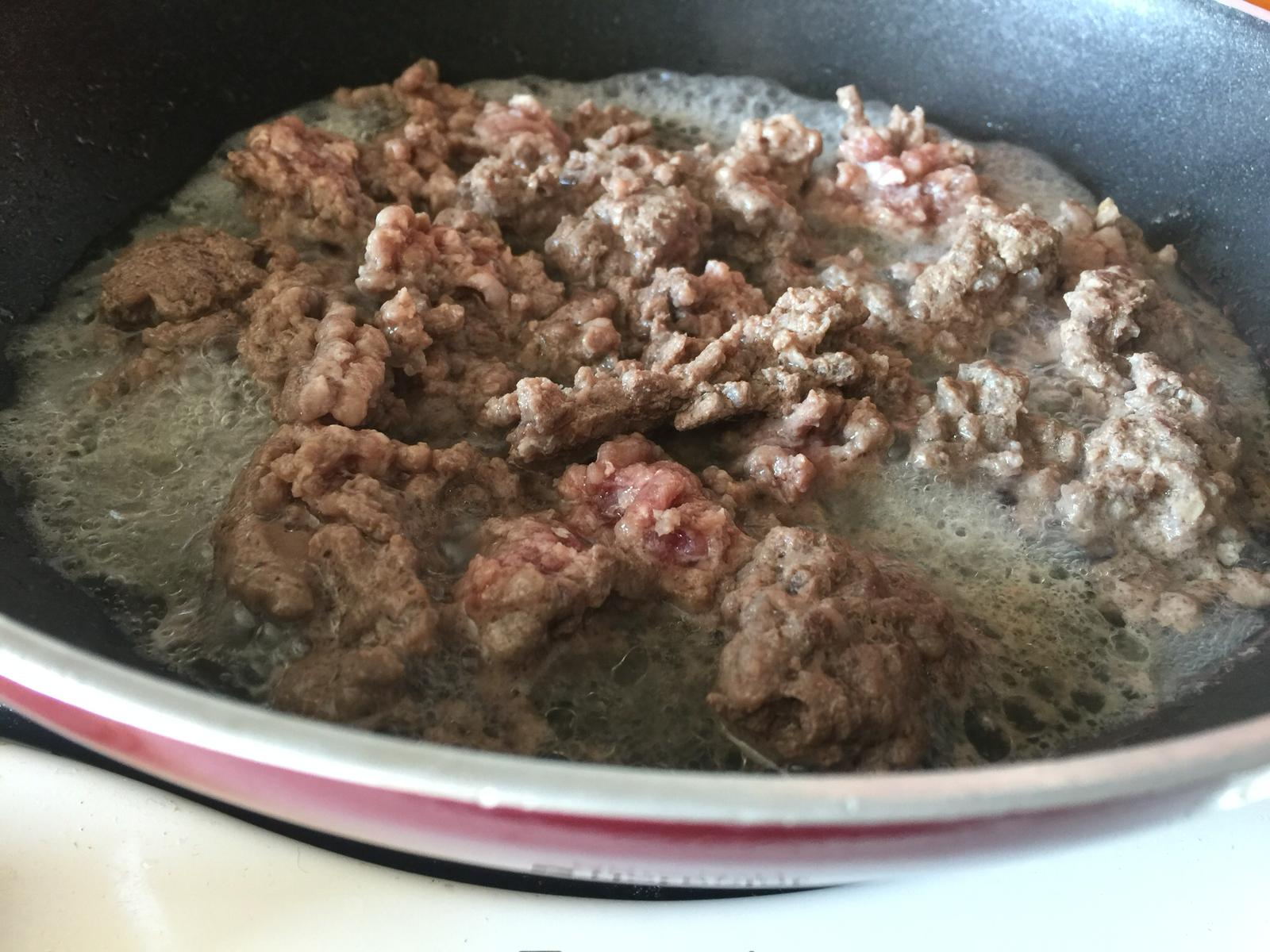 Kıyma tavaya alınır, 1 fincan su ilave edilip suyunu çekene kadar kavrulur.