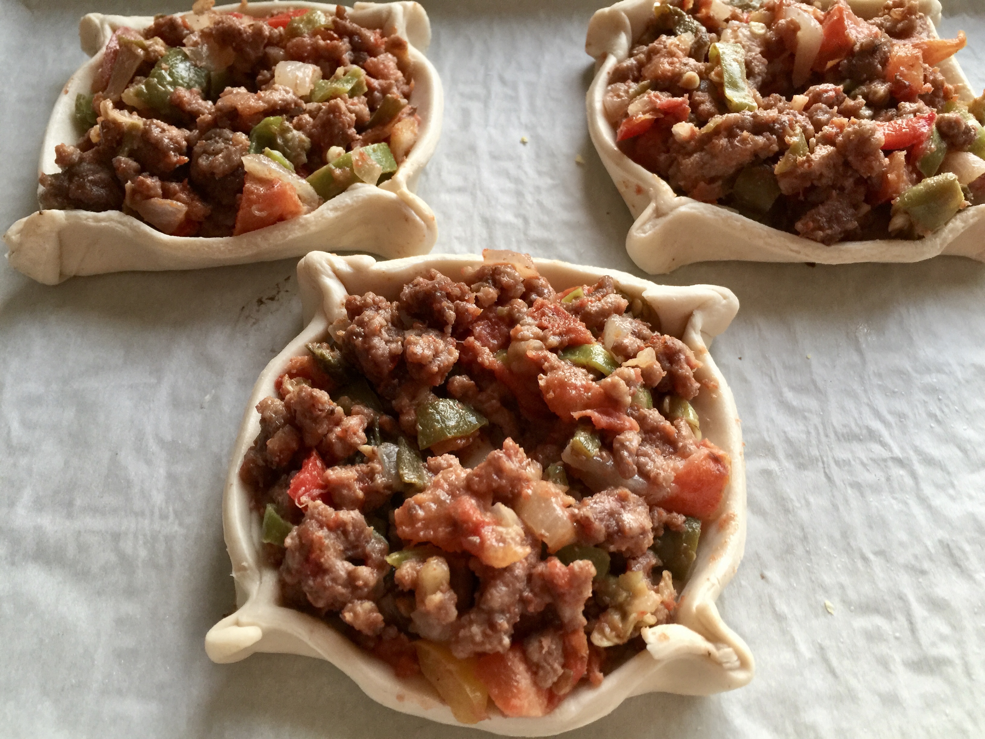 Kuru soğan, yeşil biber, taze soğan, kırmızı kapya biber ve domates çok minik doğranıp tavada kıyma ile kavrulur. ( Milföy hamuru yağlı bir hamur olduğu için tüm malzemeler yağsız olarak kavrulur.)