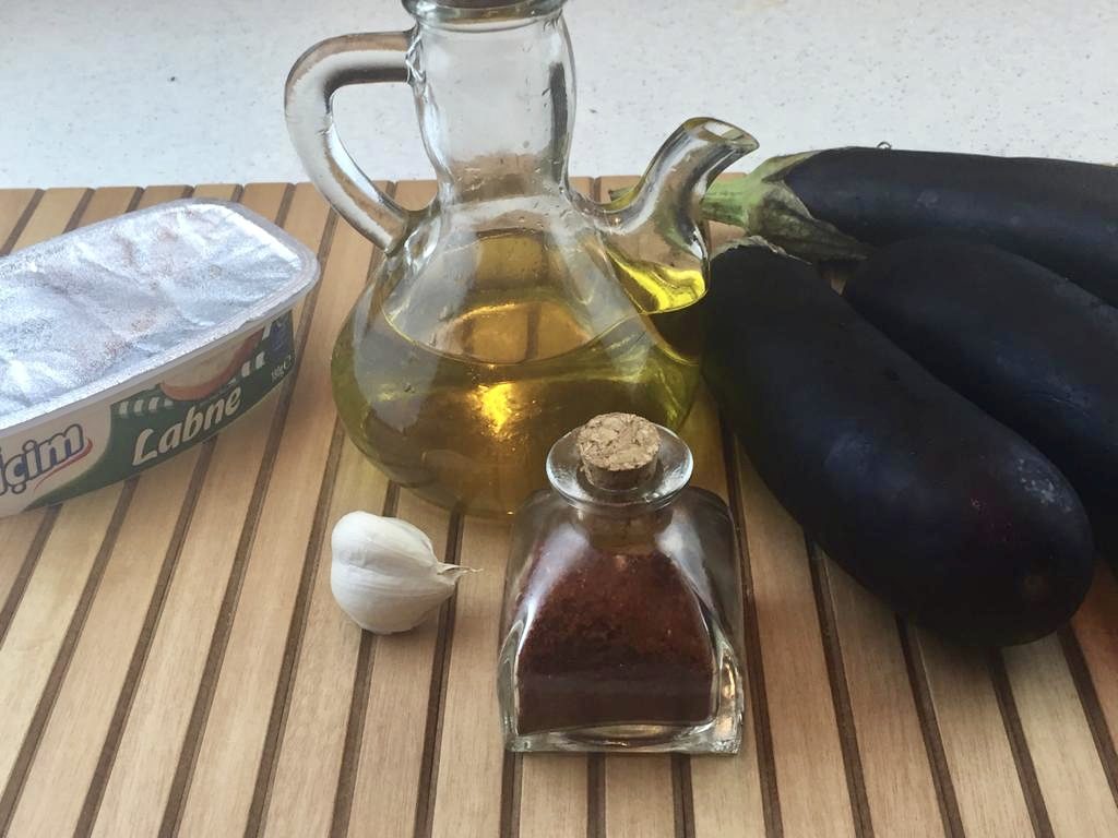 Labne peynirin içine dövülmüş sarımsak eklenir, doğranmış köz patlıcanlarla karıştırılır.