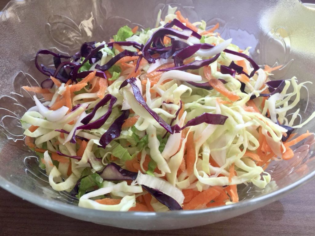 Lahanalar incecik kıyılır, havuçlar rendelenir, kuru soğan yarım ay şeklinde doğranır.