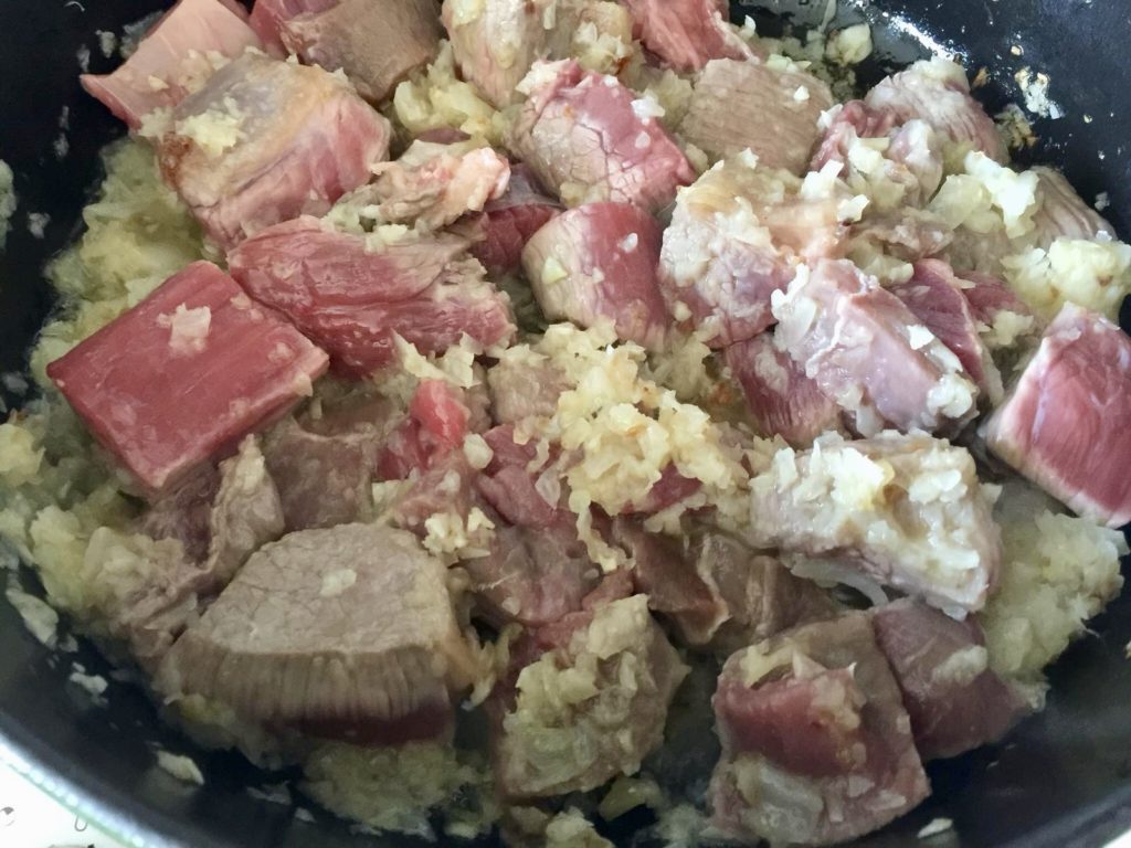 Etler ilave edilir. Etler suyunu çekince salça ilave edilir.