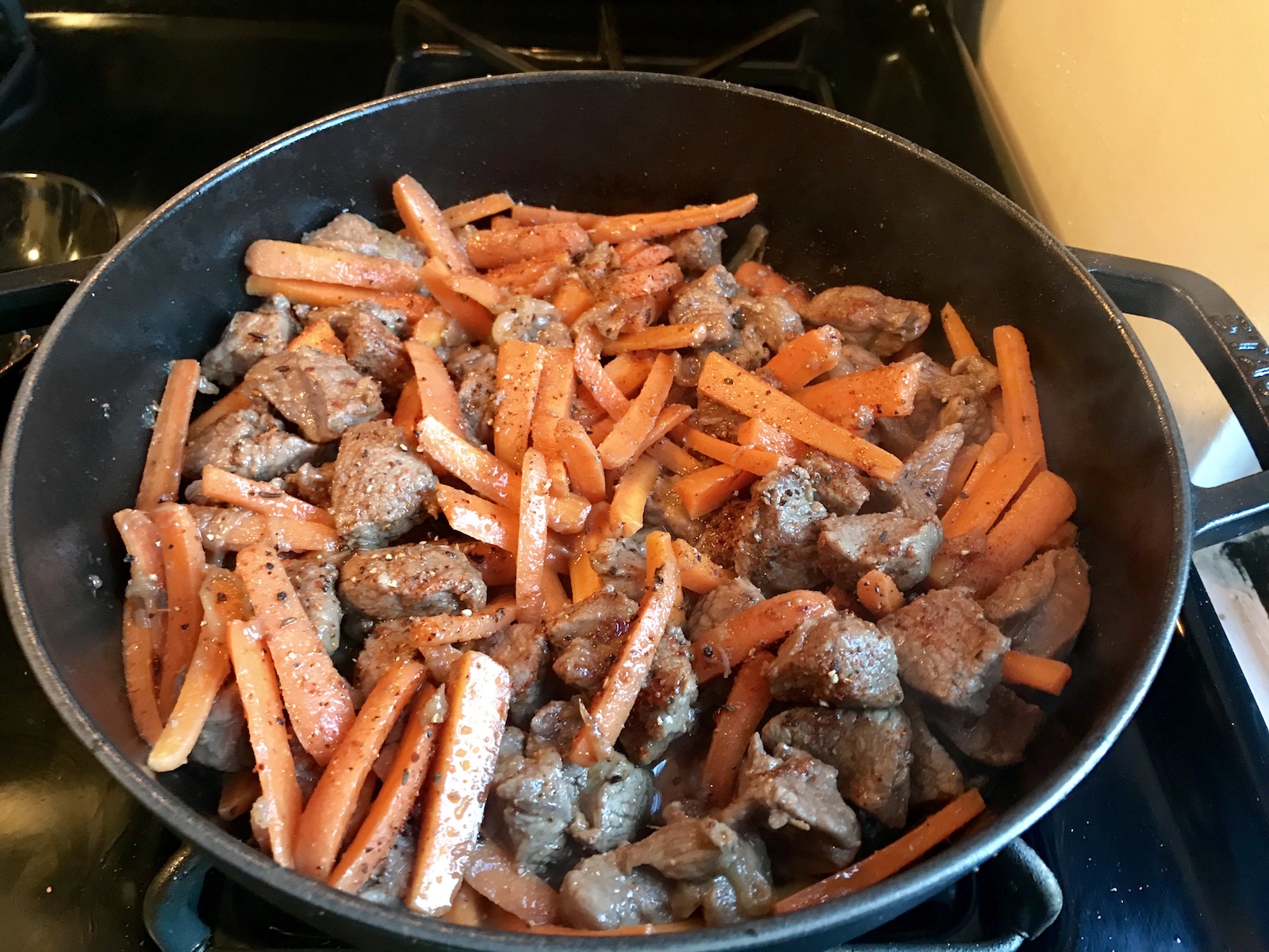 Havuçlar eklenir ve 10 dakika daha pişirilir.