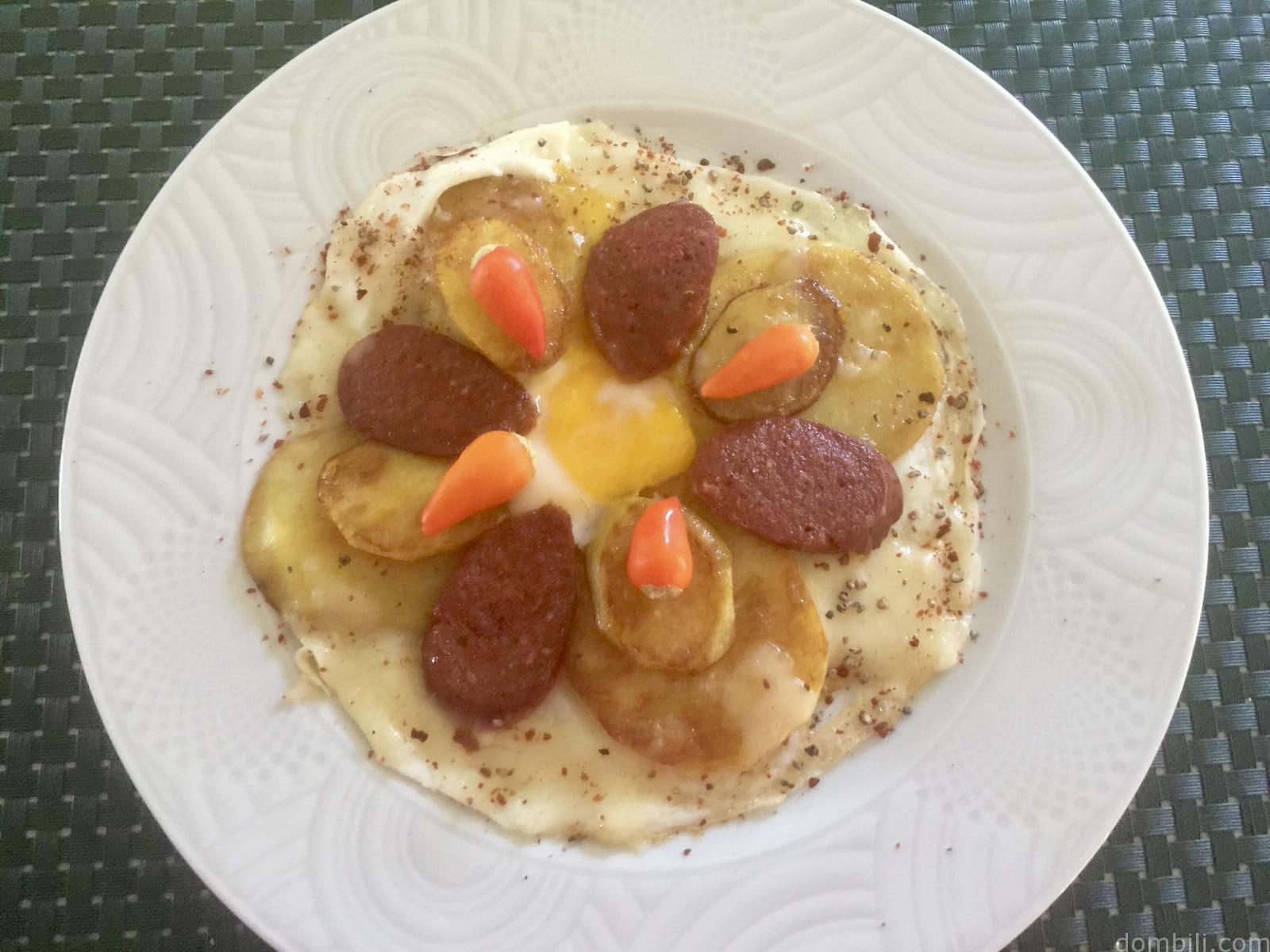 Yumurtanın sarısı ayrılıp, tavanın ortasına beyazı çatalla çırpılıp patateslerin etrafına dökülür.
