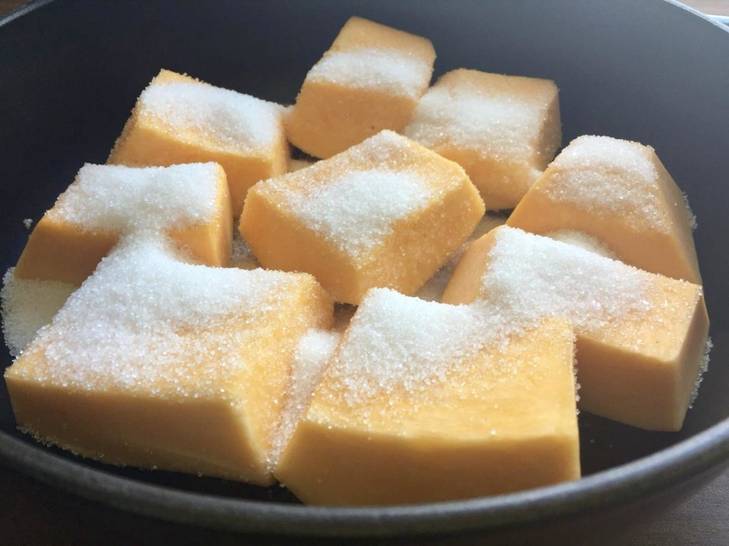 Tencereye alınan kabak dilimlerinin üzerine toz şeker serpilip birkaç saat kabağın sulanması için bekletilir. (Vaktiniz yoksa toz şeker serpilip 1 çay bardağı su ilavesi ile hemen pişirilebilir)