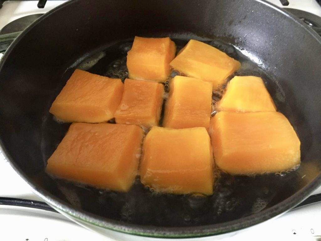 Bal kabağı dilimlenip kabukları soyulduktan sonra istenilen büyüklükte doğranır.