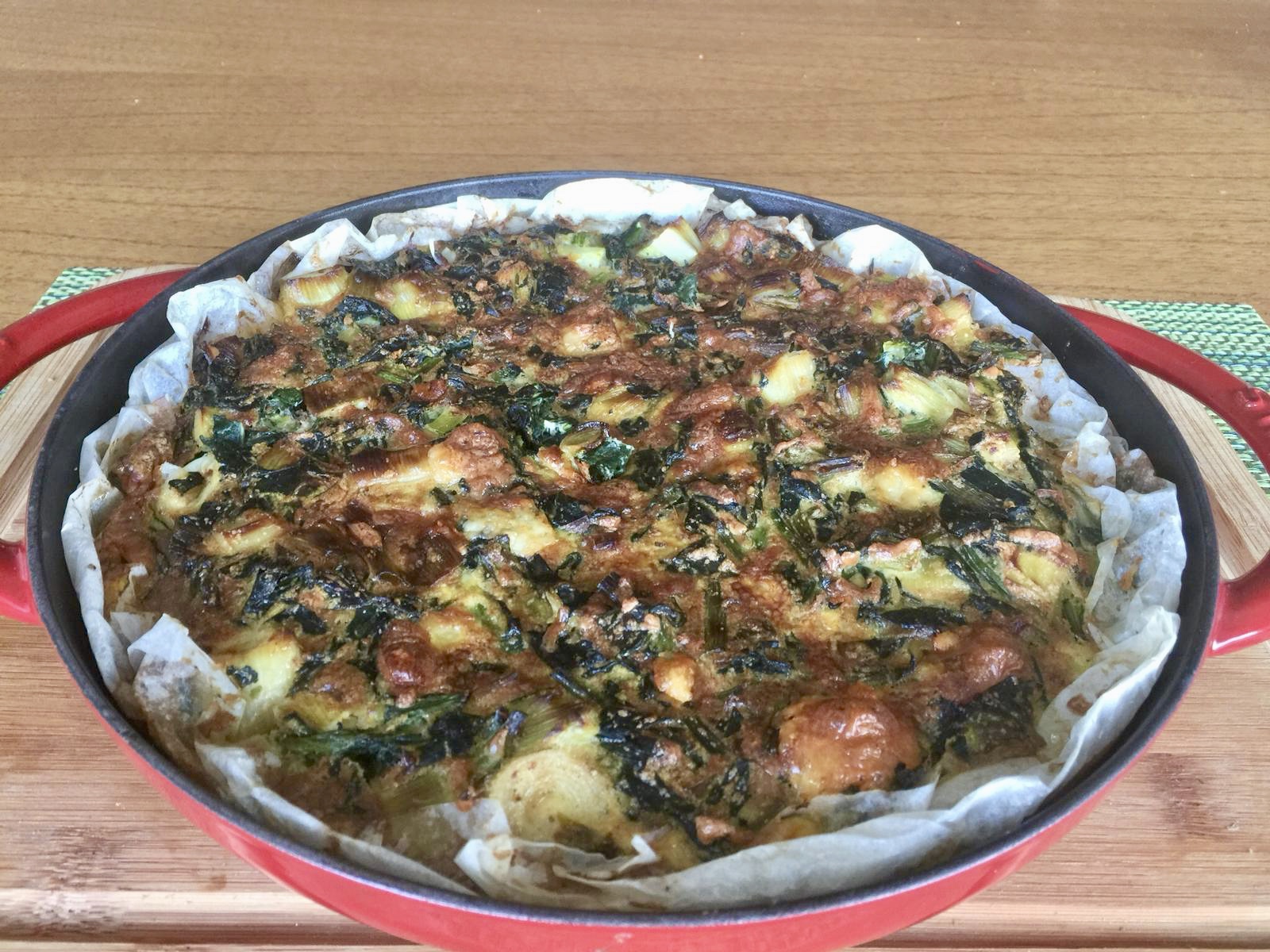 Pırasalı ıspanak 5 yumurta sarısı, rende parmesan, küçük doğranmış eski kaşar, granül hindistan cevizi, karabiber (arzu edilirse kırmızı pul biber) ile bir kaba alınır.