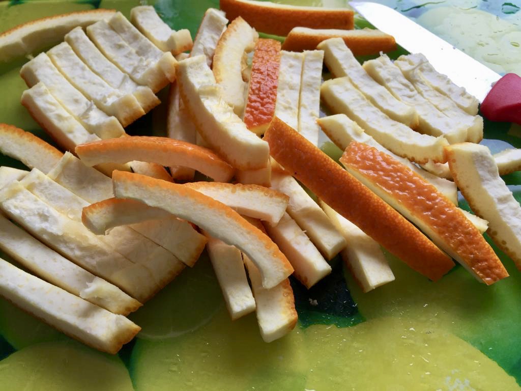 Yıkanan portakallardan iki tanesinin kabukları soyulur, ince çubuklar halinde doğranır.
