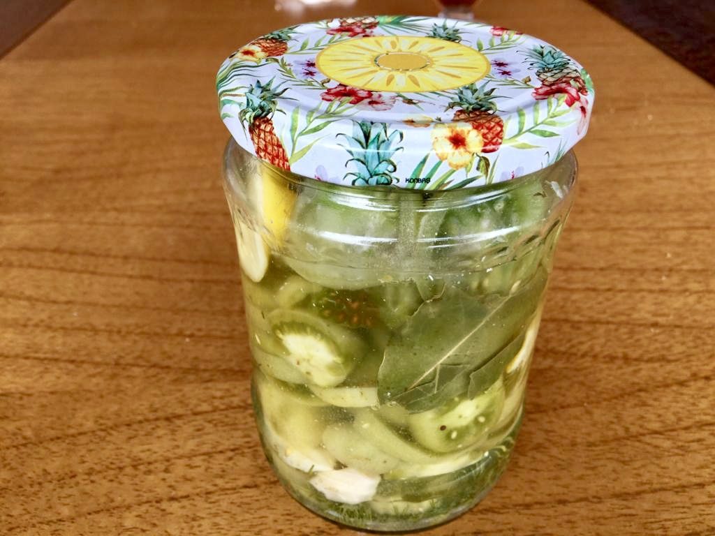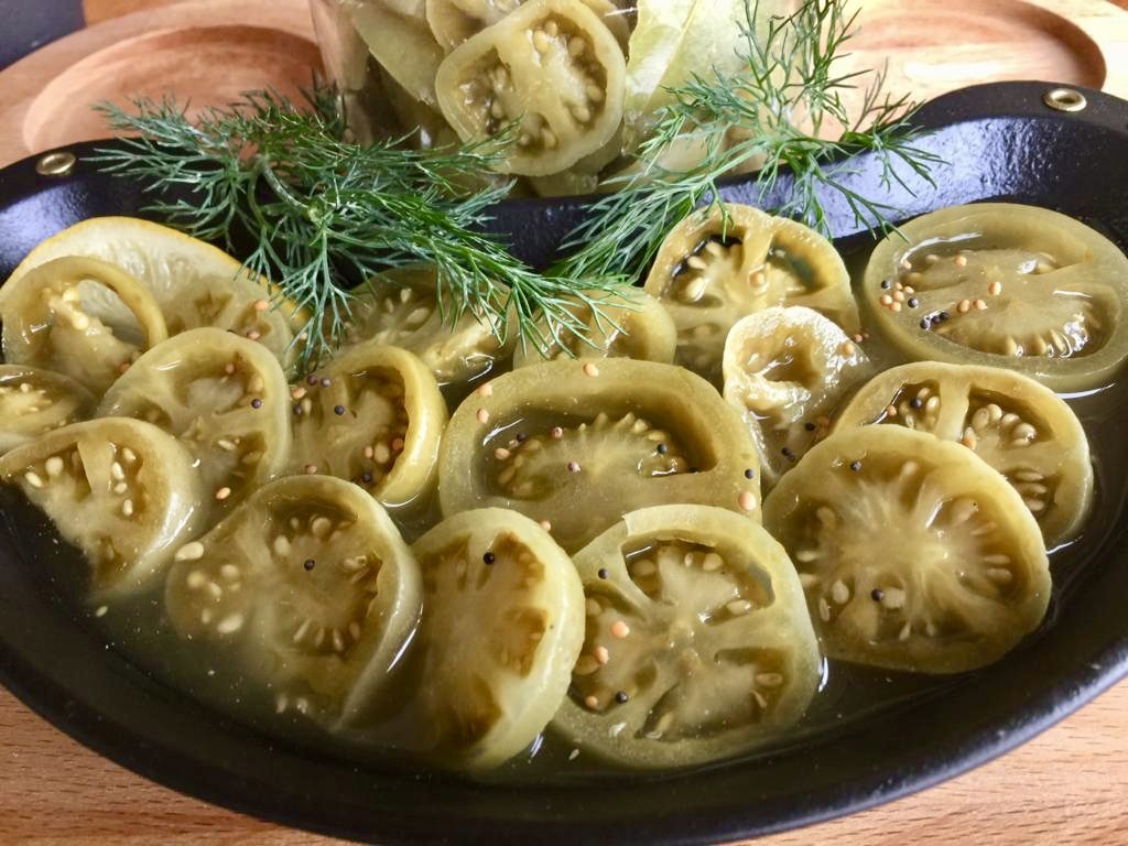 Doğranmış yeşil domatesler, sarımsak, limon dilimleri, defne yaprağı, kaya tuzu, hardal tohumu ve kişniş ilave edilir.