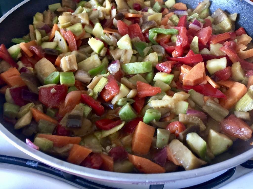 Tüm sebzeler soğan, sarımsak ve 2 yemek kaşığı zeytinyağı ile 5 dakika sotelenir, tuz ve karabiber ilave edilir.