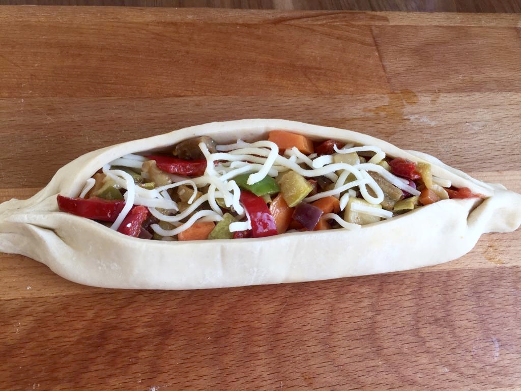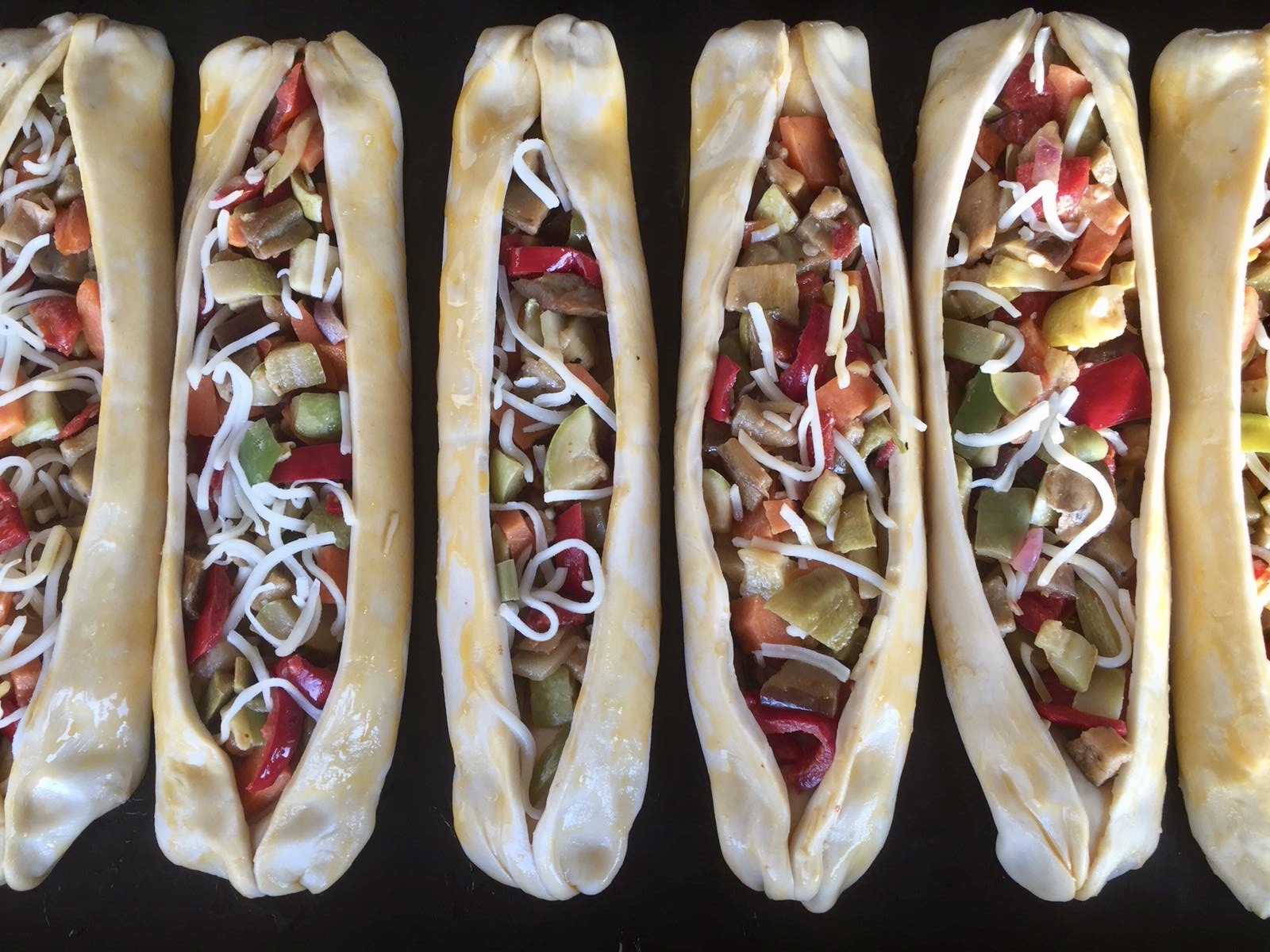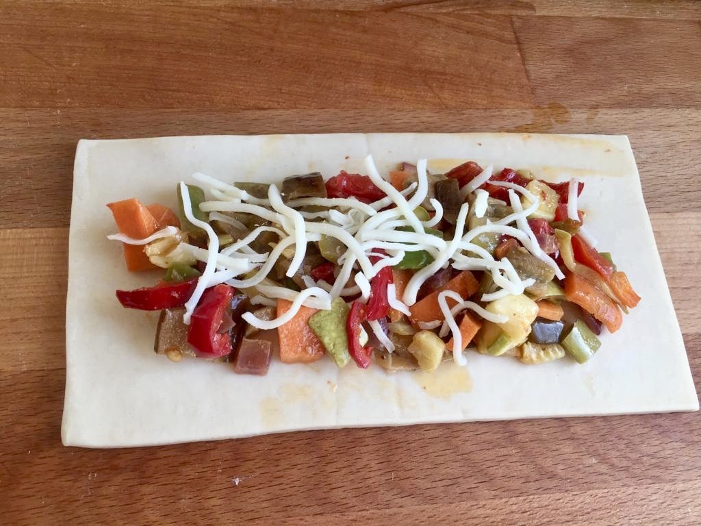 Sotelenen sebzeli karışımdan 3-4 yemek kaşığı milföy hamurunun ortasına koyulur. Üzerine 1 kaşık rende mozzarella peynir koyulur.