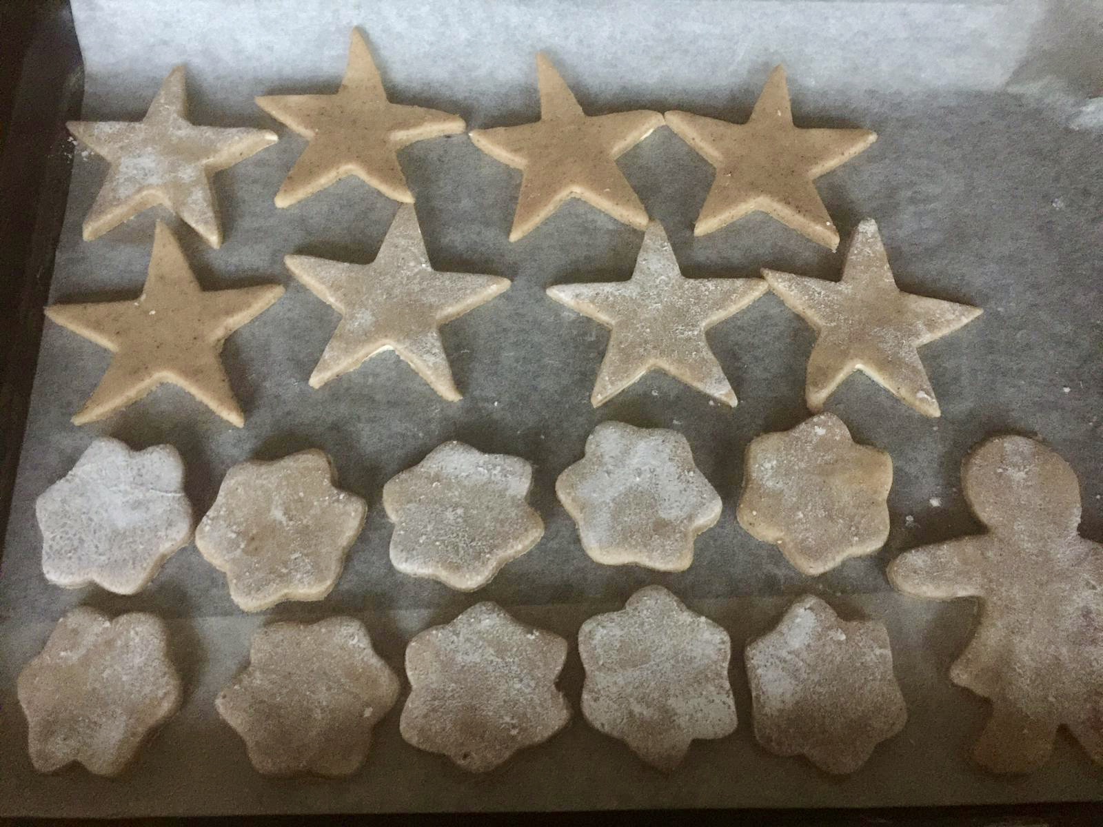 Buzdolabında yarım saat bekletilen kurabiye hamuru, nişastalı zeminde merdane ile bastırılmadan açılır. Kurabiye kalıpları ile kesilir.