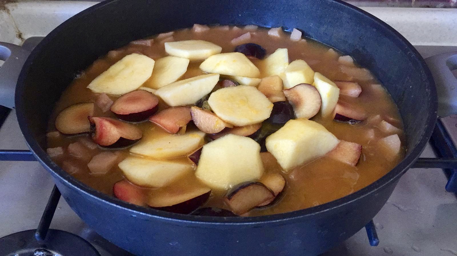 Ayvalardan daha büyük parçalar halinde doğranan elma, armut ve erikler mandalina suyu eklenerek meyvalar yumuşayana kadar pişirilir.