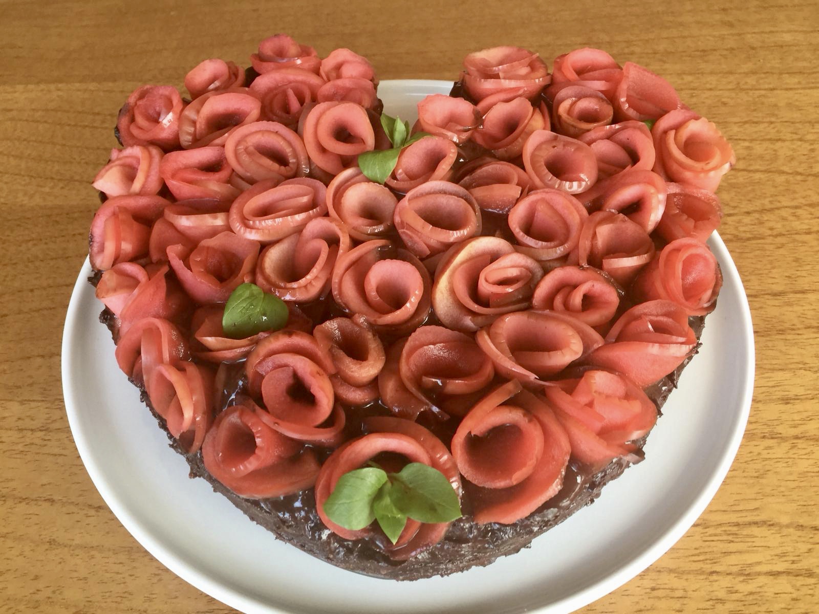 Pişirilmiş elmalar gül şeklinde sarılır ve çikolatalı sos dökülen pastanın üzerine sıra ile yerleştirilir.