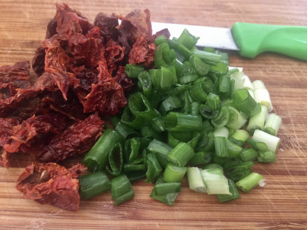 Sıcak suda çok az bekletilerek yumuşatılan kurutulmuş domatesler ve ayıklanıp yıkanan taze soğanlar ince doğranır.