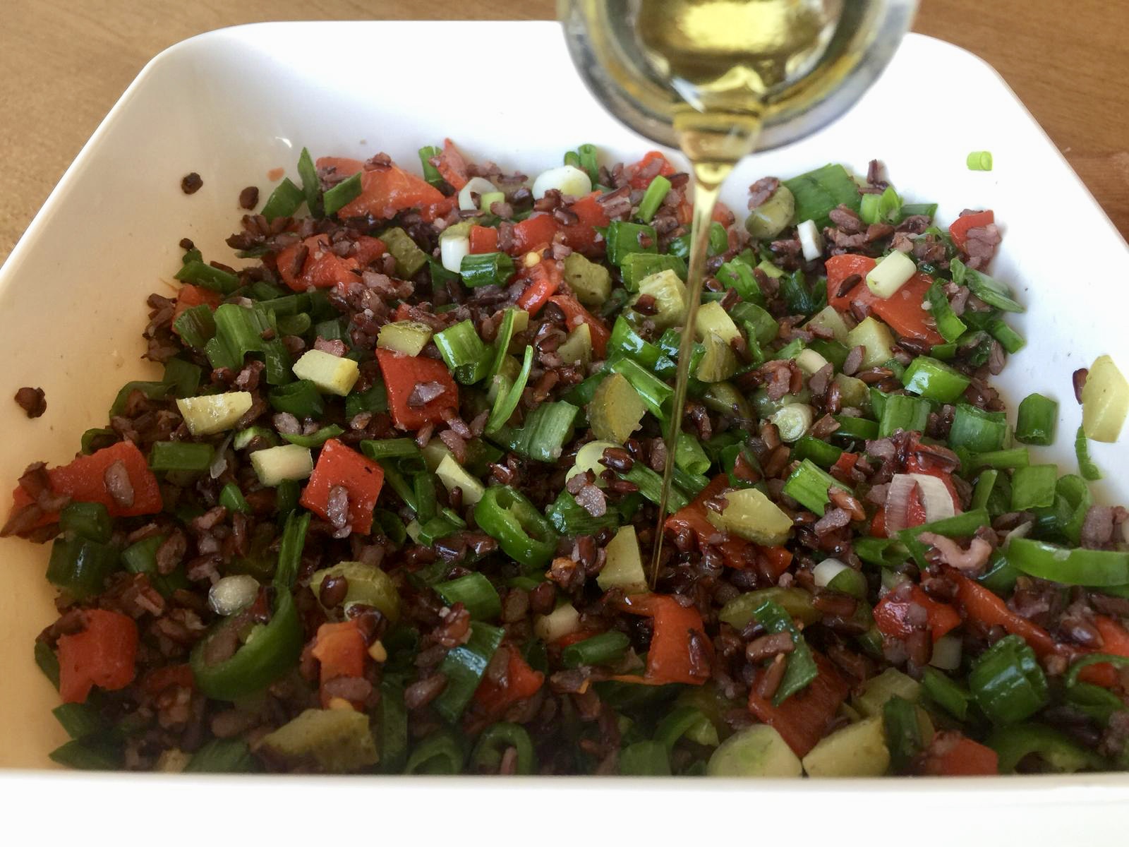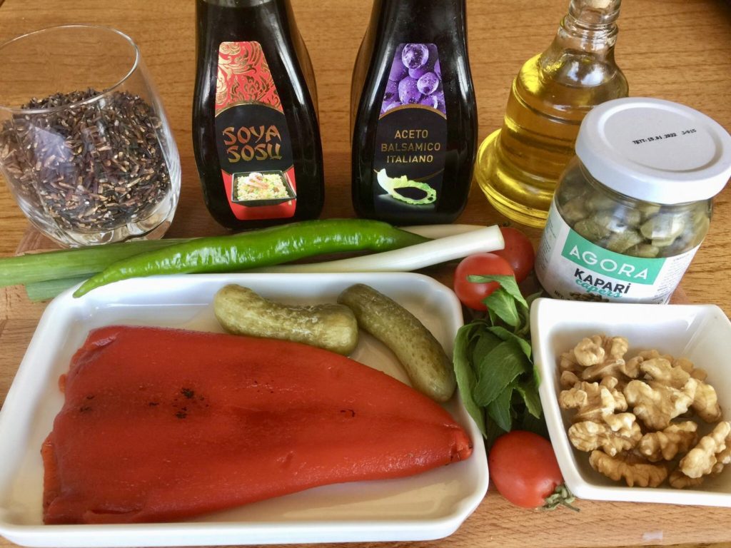 Haşlanmış pirinç, küçük doğranmış yeşil biber, domates, taze soğan, kornişon turşu ve köz biber bir kabın içinde toplanır.