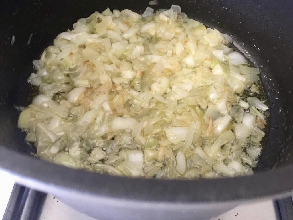 Fasulyeyi pişireceğimiz tencereye koyulan tereyağı ve sıvı yağ (fındık yağı) içinde tavla zarı büyüklüğündeki kuru soğanlar ve ince doğranmış sarımsaklar kavrulur.