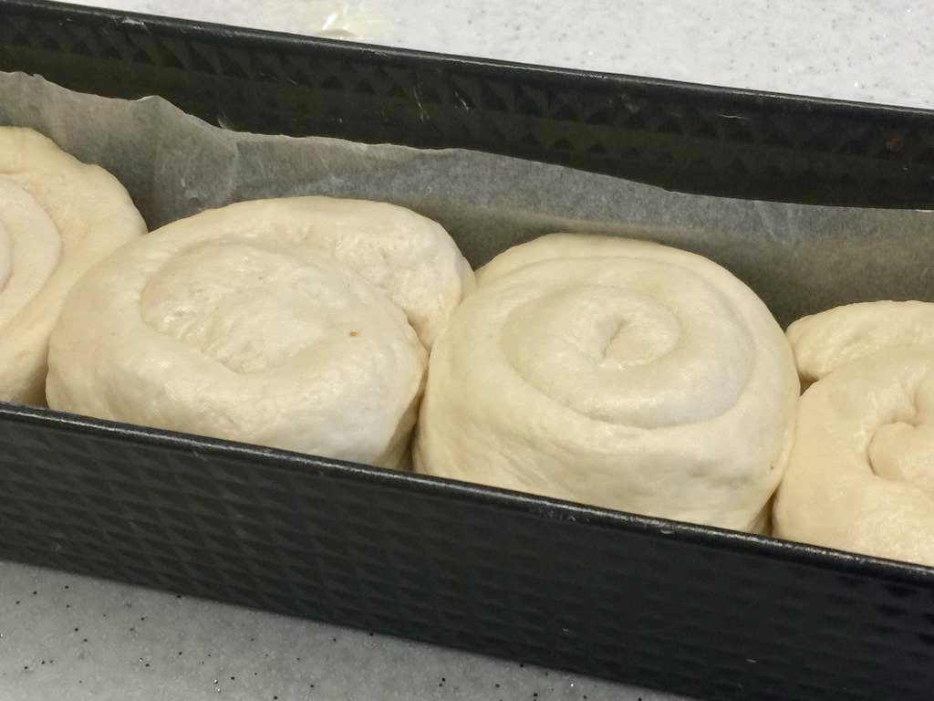 Yağlı kağıtla kaplanmış dikdörtgen kek kalıbına rulolar yan yana yerleştirilir.