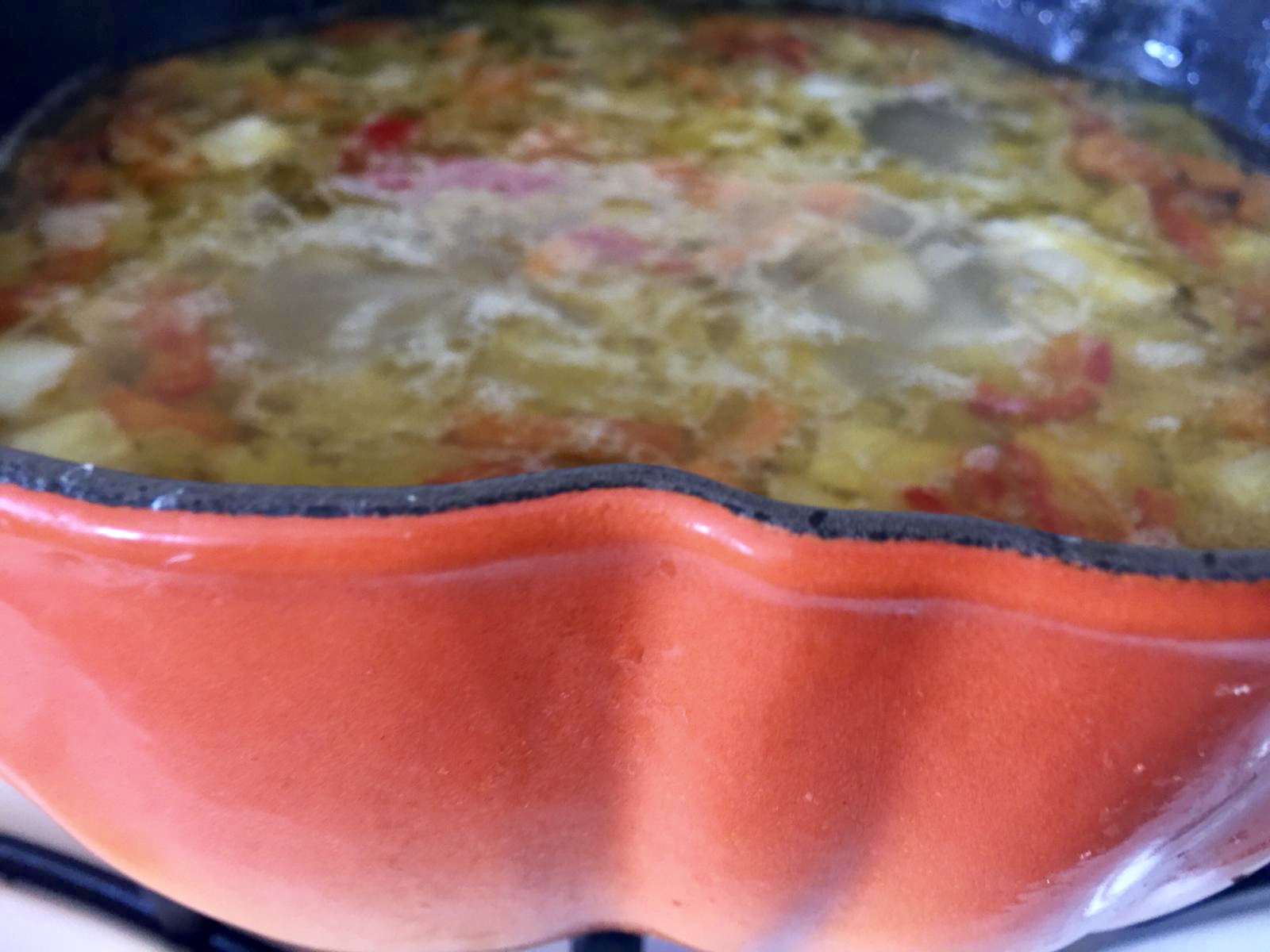 5 su bardağı ılık su ilavesi ile sebzeler yumuşayana kadar kısık ateşte 10 dakika pişirilir.