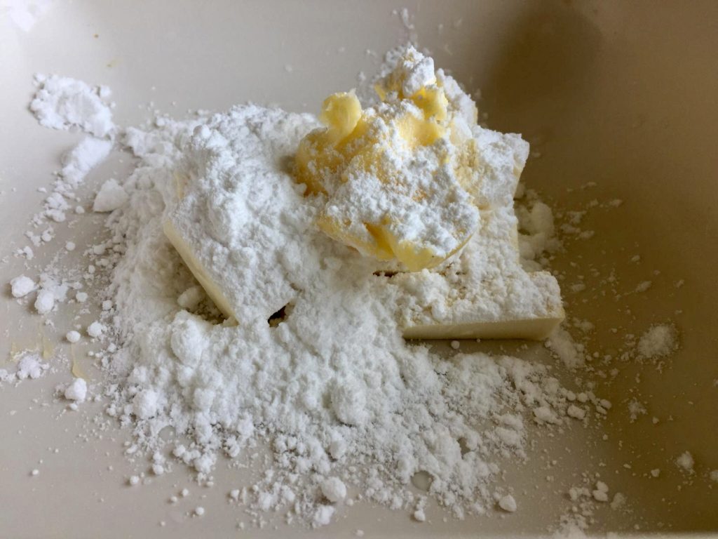1 su bardağı pudra şekeri oda ısısındaki tereyağı ile krema haline gelene kadar yoğrulur.