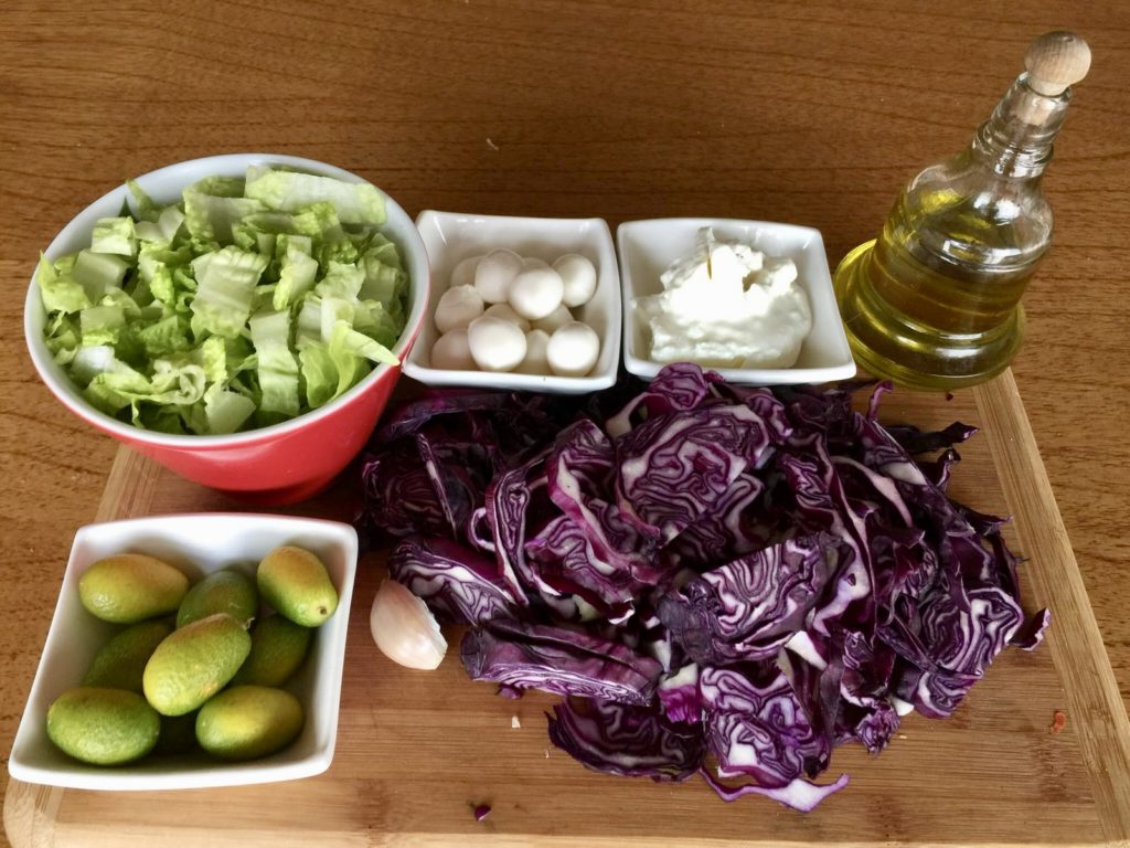 Salatanın üstü ikiye kesilmiş kumkuat ve peynirle süslenir.