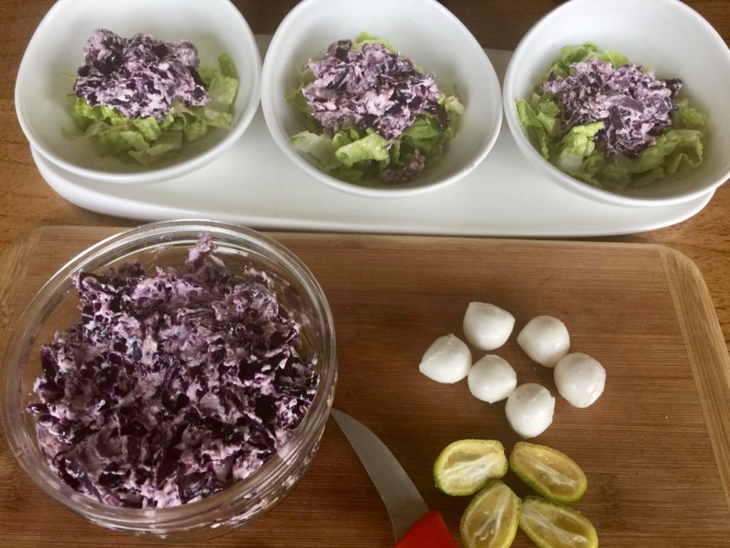 İnce doğranmış marullar salata tabaklarına koyulur. Üzerine yoğurtlu lahana eklenir.